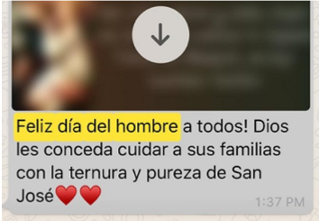 En ese segundo encuentro ya pudimos adentrarnos en los detalles que buscaba, resulta que el día del hombre consiste en celebrar la existencia del hombre a través de ciertos presentes, por ejemplo, en las oficinas se hace una pequeña fiesta con regalos y comidas, ambas cosas realizadas, normalmente, por las mujeres. Más allá de ese carácter festivo tiene un sentido religioso, pues se conmemora el Día de San José modelo de humildad y silencio.