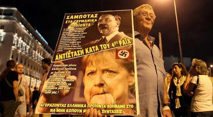 Los periódicos griegos respondieron ante tales ataques, en concreto, el periódico griego Eleftheros Typos publicó una foto manipulada digitalmente de la estatua de Victoria en la Columna de la Victoria de Berlín, en la que se muestra a Victoria levantando una esvástica, símbolo del Partido Nazi de Alemania en 1920. Otros medios de comunicación griegos describieron que la cultura alemana contemporánea todavía sigue bajo la sombra del nazismo. Todo ello fue acompañado por manifestaciones en Atenas y Salónica en las cuales se exhibieron imágenes de Angela Merkel usando un uniforme nazi.